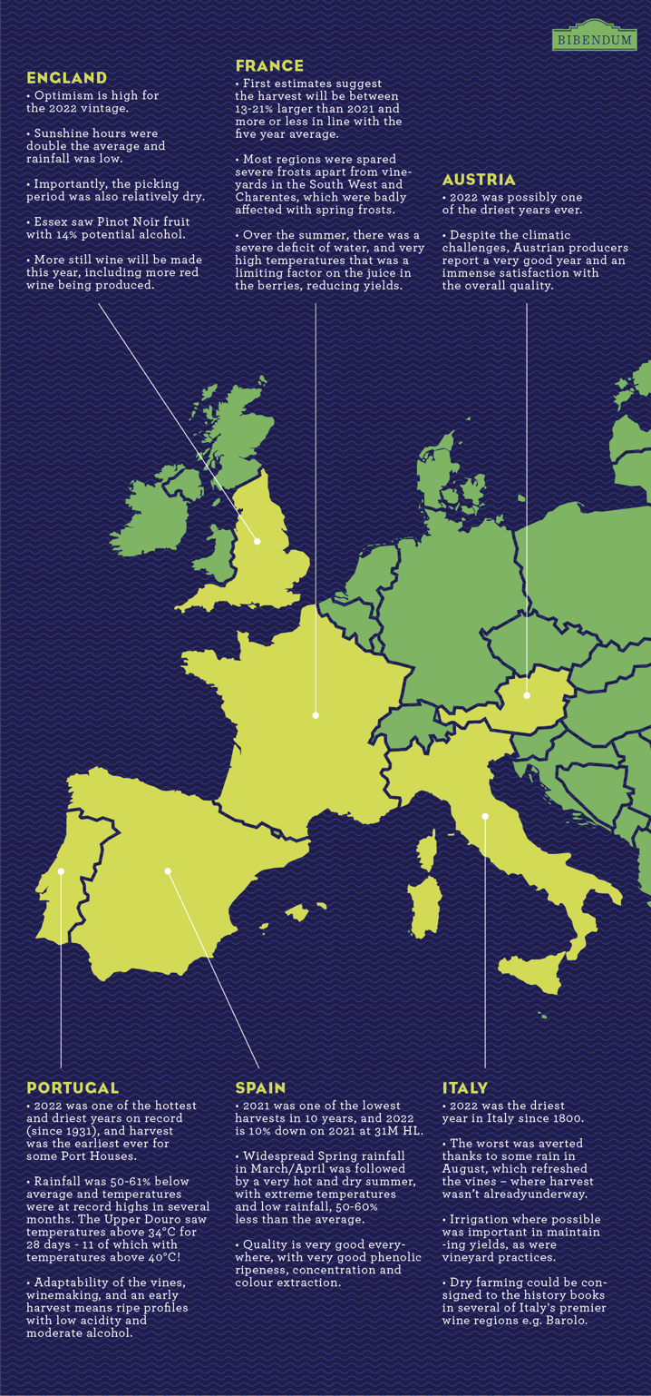 In the Northern Hemisphere, vintage 2022 was a challenging one, with most countries reporting atypical conditions throughout the year, as well as drought and extreme heat, mostly resulting in lower-than-average yields. But despite the climatic crisis, most growers are hailing 2022 as an exceptional and complex year.